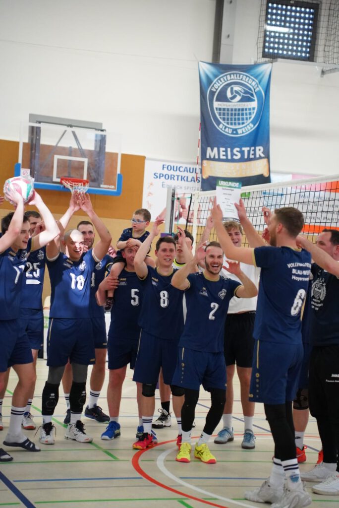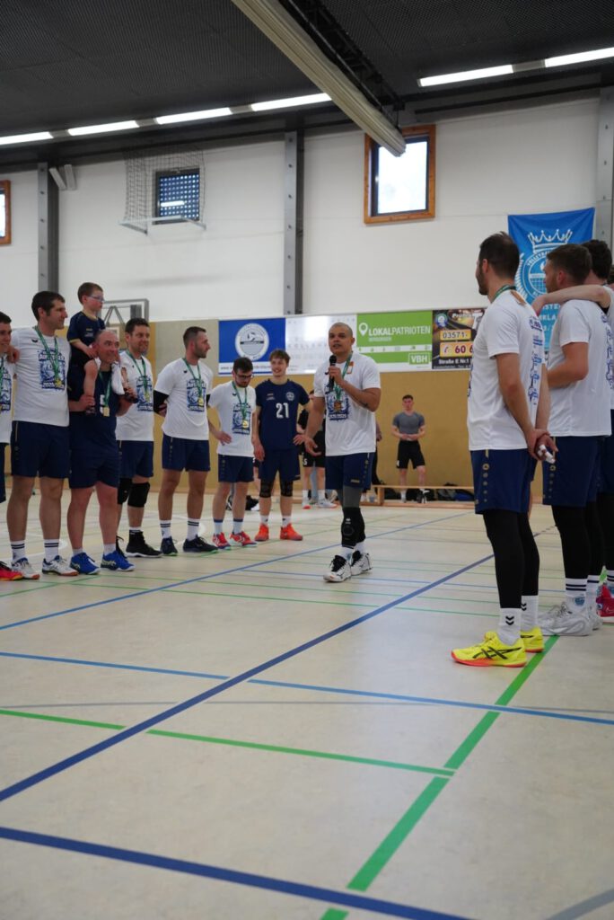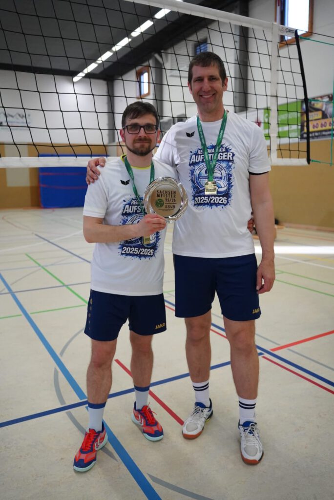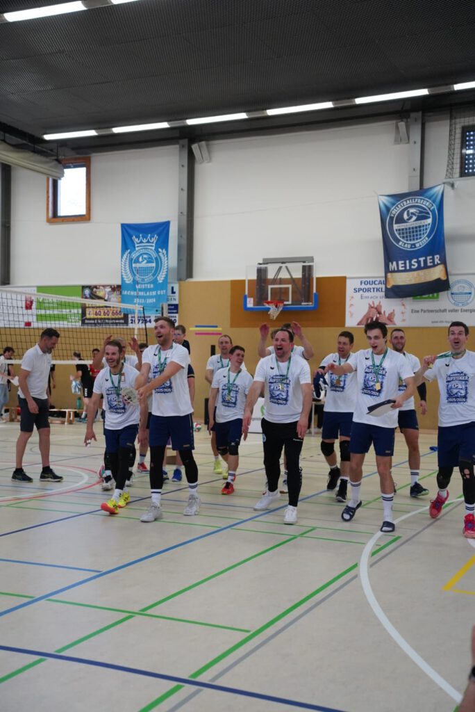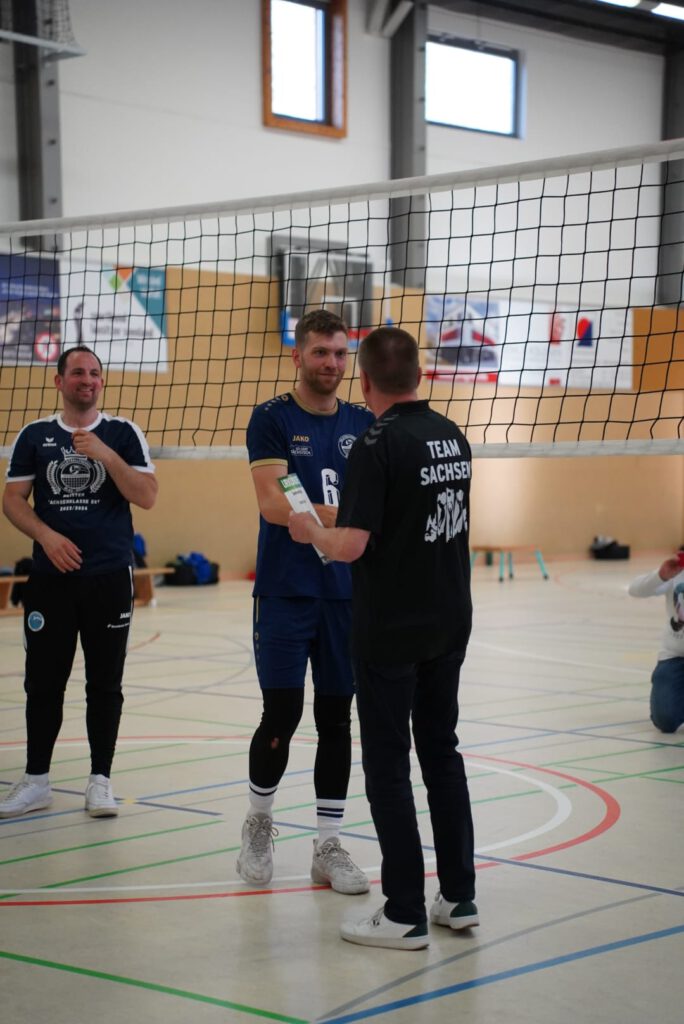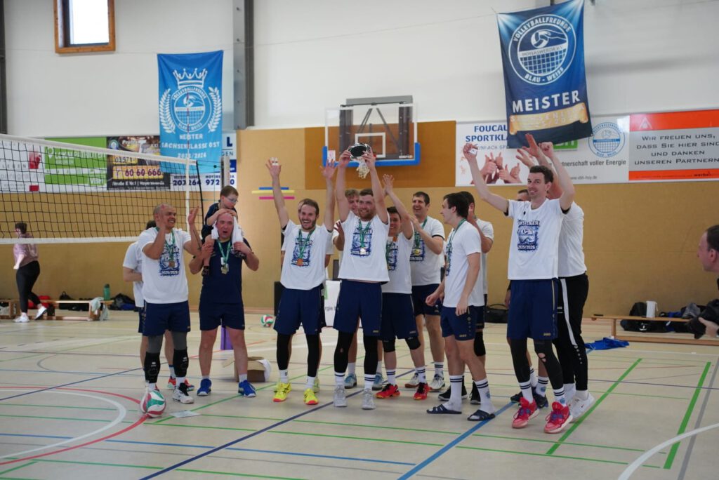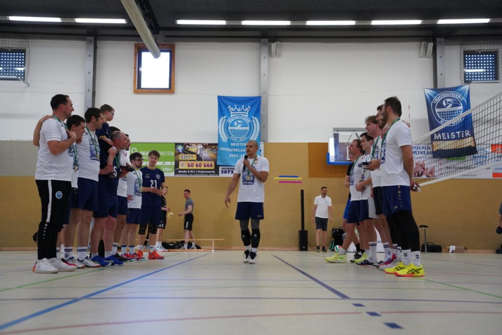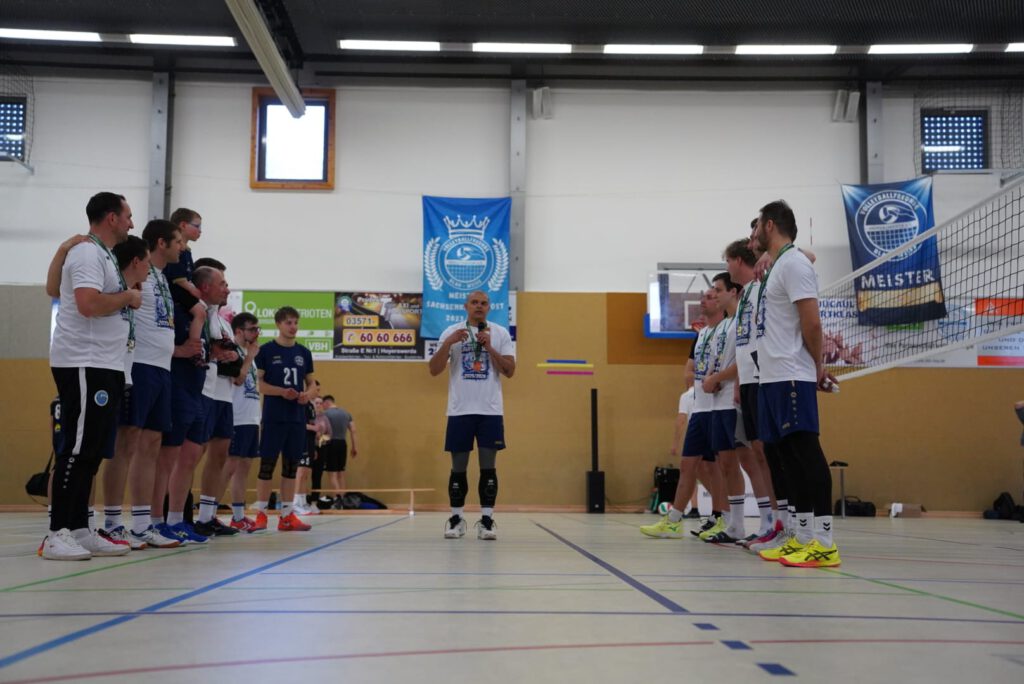 Auch hier erhielt zum Abschied ein Spieler die Ehre den Sachsenligameister als Kapitän auf das Spielfeld anzuführen. Mit nun 46 Lebensjahren und dennoch unermüdlichen Einsatz bei Training, Wettkampf und Organisation verlässt Jens Paulick das Team und lässt nach dem auch für ihn größten Erfolg seine Volleyballkarriere ausklingen. In den letzten drei Sätzen dieser Saison bekamen dann auch noch die beiden Jugendspieler Eric Beyer (Mittelblock) und Vin Spaniel (Libero) die Chance, sich auf Landesebene zu beweisen. Sie hinterließen einen sehr guten Eindruck und werden vielleicht den Schritt in die erste Mannschaft dauerhaft schaffen. Auch wenn die Begegnung mit 0:3 (21-, 24-, -21) verloren ging, wurde das Team bis zum letzten Ballwechsel unterstützt und für die phänomenale Saisonleistung bejubelt.