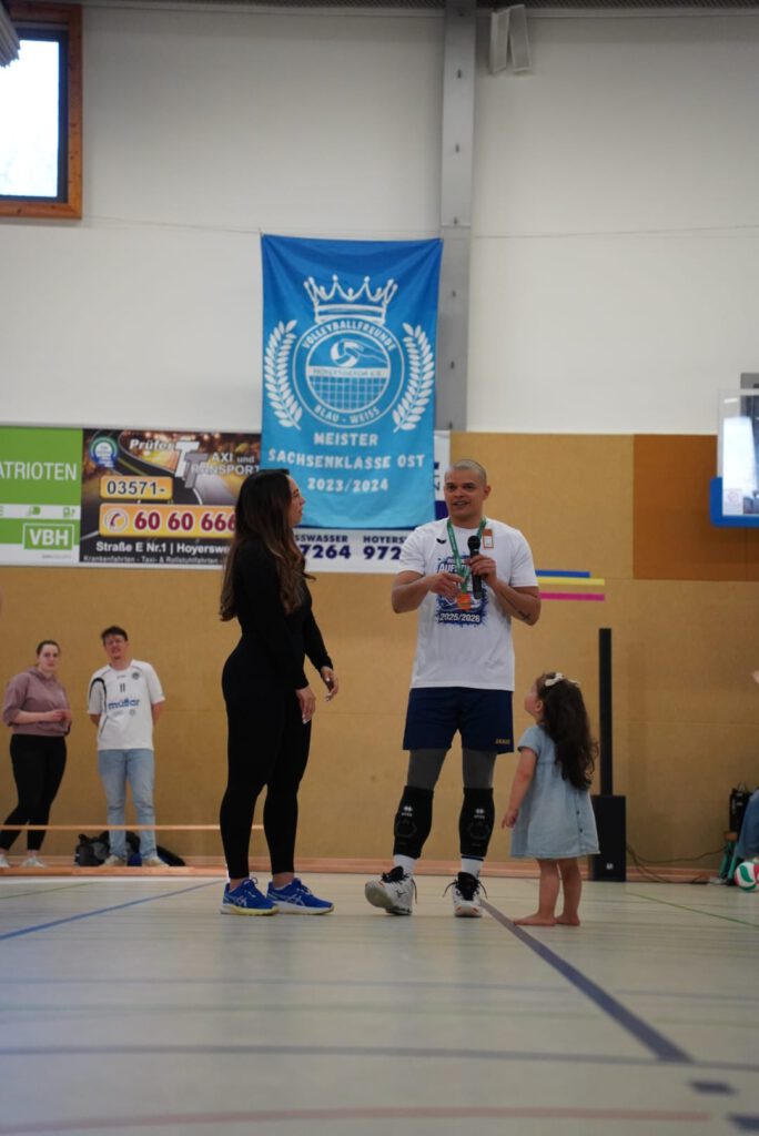 Und nach Spielende folgte ein weiteres, noch nie da gewesenes Highlight. Nach einer emotionalen Ansprache an den Verein, seine neue Heimat und sein Team machte Lunardy Pulvett seine Freundin vor den Augen der Tochter einen Heiratsantrag. Dieser Moment setzte diesem Tag dann die sprichwörtliche Krone auf. Der amtierende Meister der Sachsenliga und nun neuer Regionalligist bedankt sich bei den Familien und Freunden, den Fans, den Sponsoren und Unterstützern für die Energie und den Geist, der das Team über die letzten Monate getragen hat.